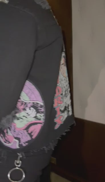 Exude effortless cool with the Audrey Graphic Denim Jacket. This bold black jacket features a vibrant Audrey Hepburn-inspired graphic in pink and purple tones, with distressed details for a vintage, rebellious edge. Button-front design and long sleeves make it versatile for layering over any look.
